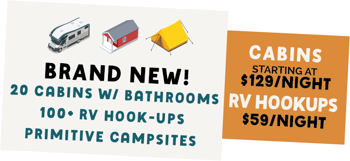 Nestled in the heart of nature’s beauty, Deer Creek offers everything from modern spots for your RV to cozy cabins with all the amenities. Don’t forget to swing by the Trails End Store for all your camping goodies!